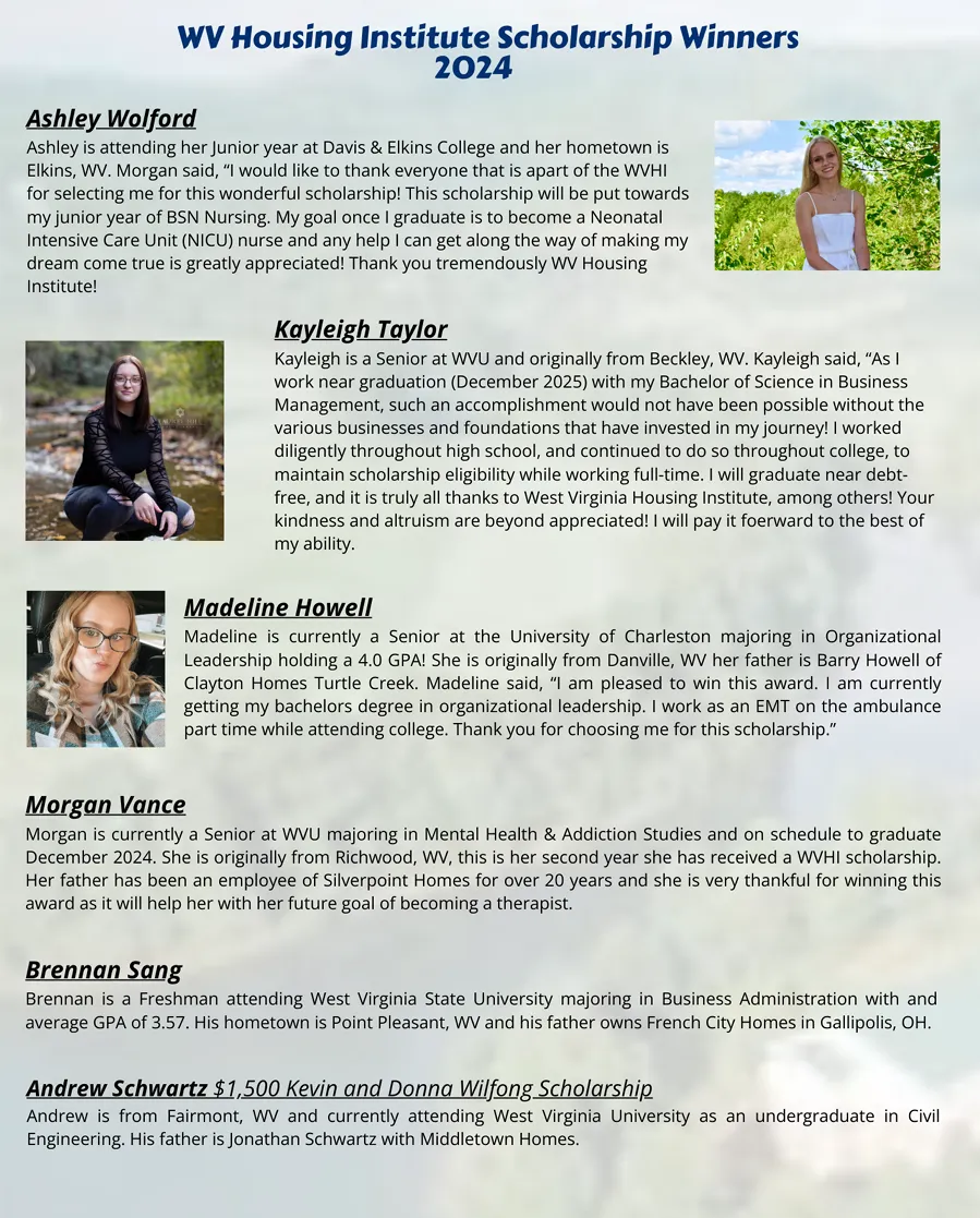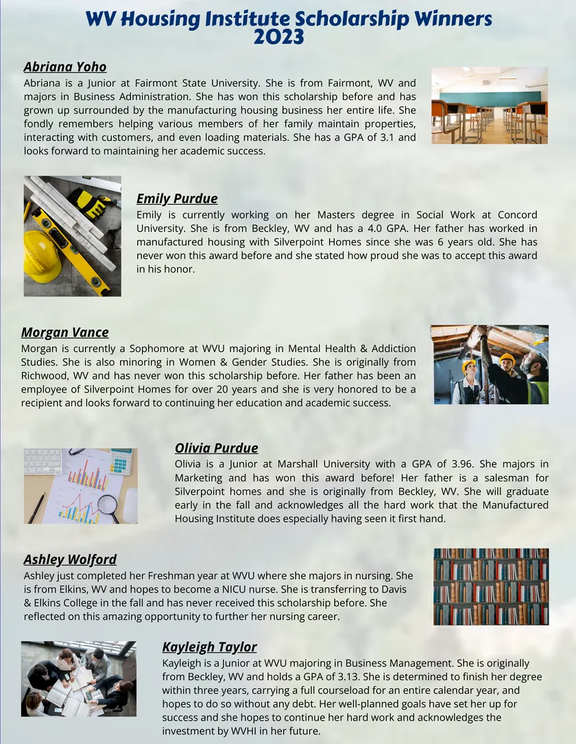 The West Virginia Housing Institute is proud to support the next generation of leaders in the factory-built housing industry through our annual scholarship program. We believe that education plays a critical role in strengthening our workforce, our communities, and our state.